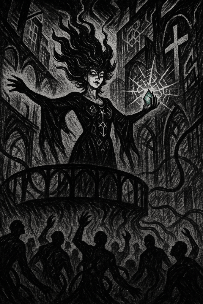 Filaments of gravitational energy unfurled from her arms, coiling like luminous serpents. Morriganne was no longer merely a priestess: she had become the puppeteer of a force beyond human comprehension.