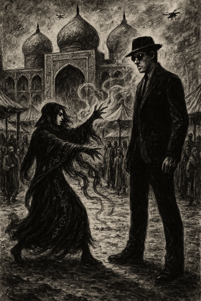 He closed his eyes and stretched out his arms, absorbing the emotional energy of the carpets, as well as that of the market and its stalls, transforming it into a pulsing wave of shadow. The sigils began to disintegrate, each fragment rebounding toward Morriganne as amplified pain. She staggered back, a rictus twisting her lips, while her own distress merged with that which she had summoned.